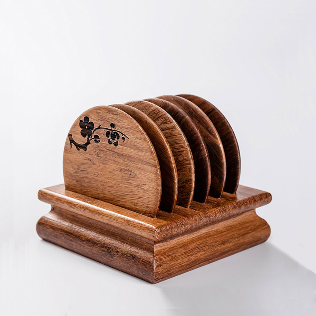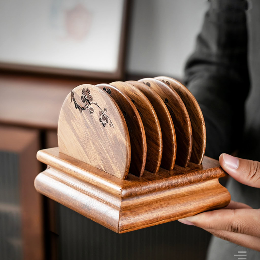 Bộ đế gỗ kèm 6 lót chén trà khắc họa tiết hoa mai không chỉ là vật dụng bảo vệ bàn trà mà còn là một tác phẩm nghệ thuật nhỏ, mang lại cảm giác an yên, mộc mạc nhưng đầy sang trọng